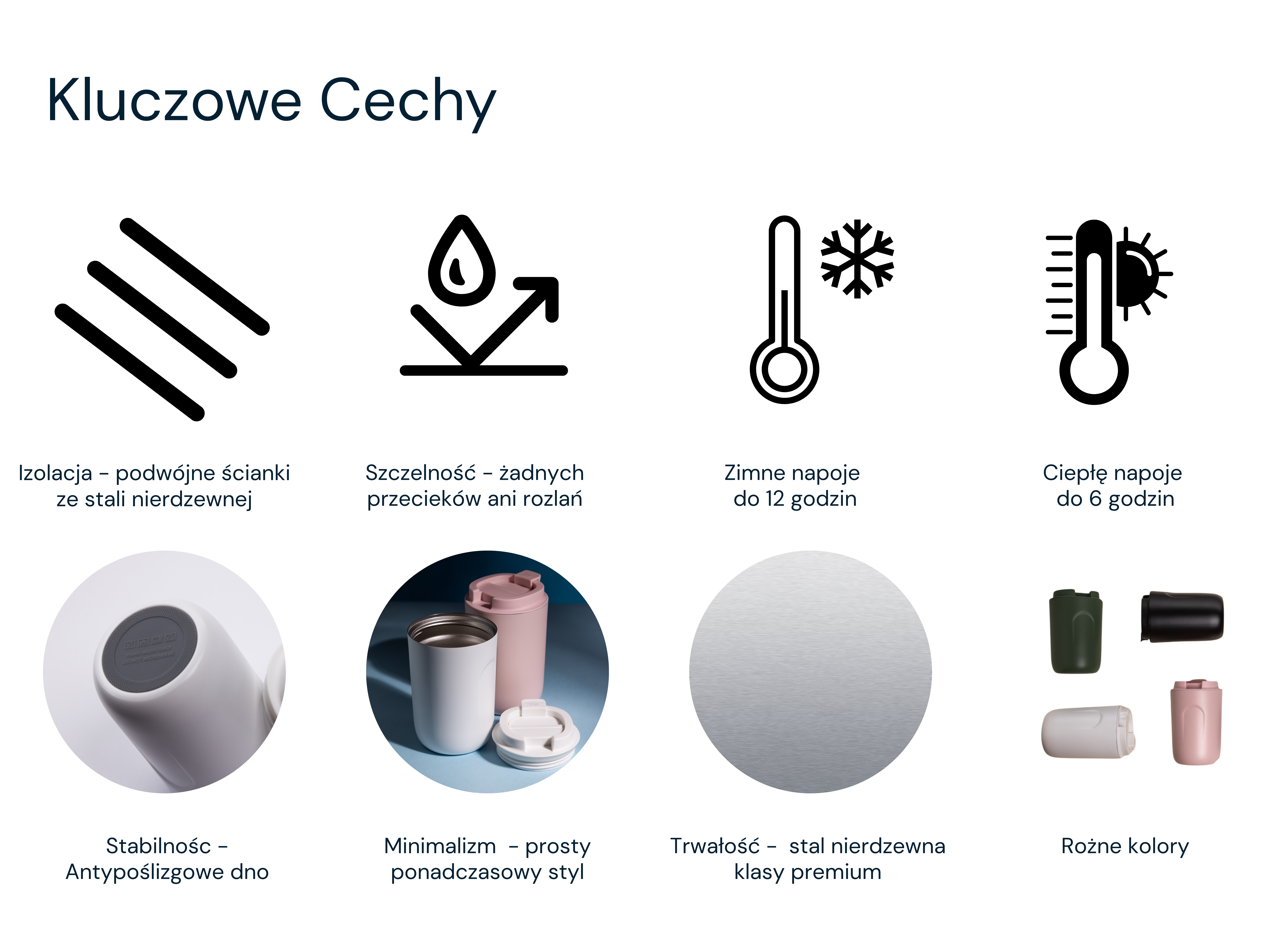 Jego praktyczna konstrukcja została zaprojektowana z myślą o codziennym komforcie – pokrywka z polipropylenu z gwintem zapobiega wyciekom, a nasadka do picia eliminuje przypadkowe rozlewy. Podwójne ścianki zapewniają optymalną izolację, chroniąc napój przed wpływem temperatury otoczenia.