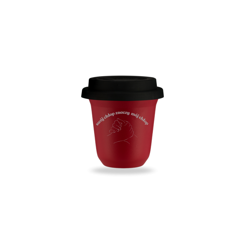 Kubek 150 ml CZERWONY "Swój chłop znaczy mój chłop", z pokrywką czarną