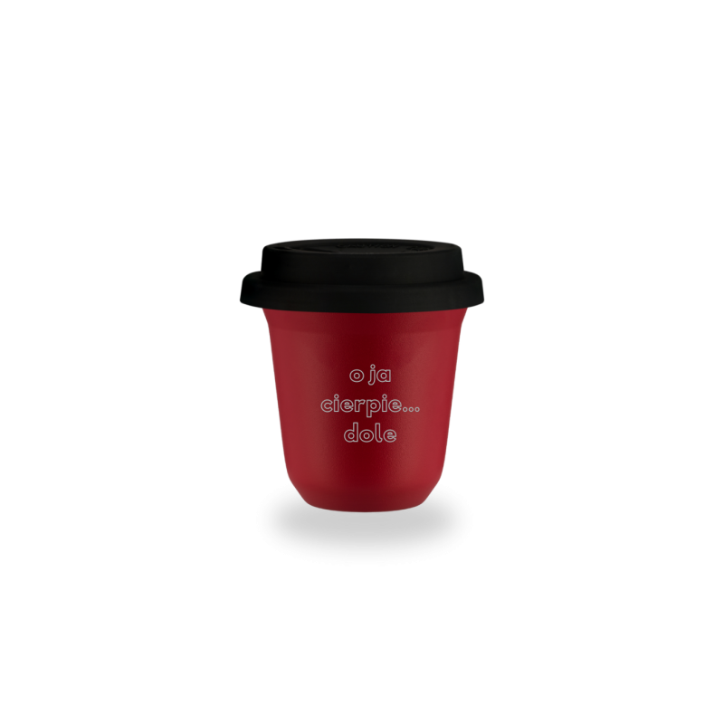 Kubek 150 ml CZERWONY "O ja cierpię dole", z pokrywką czarną