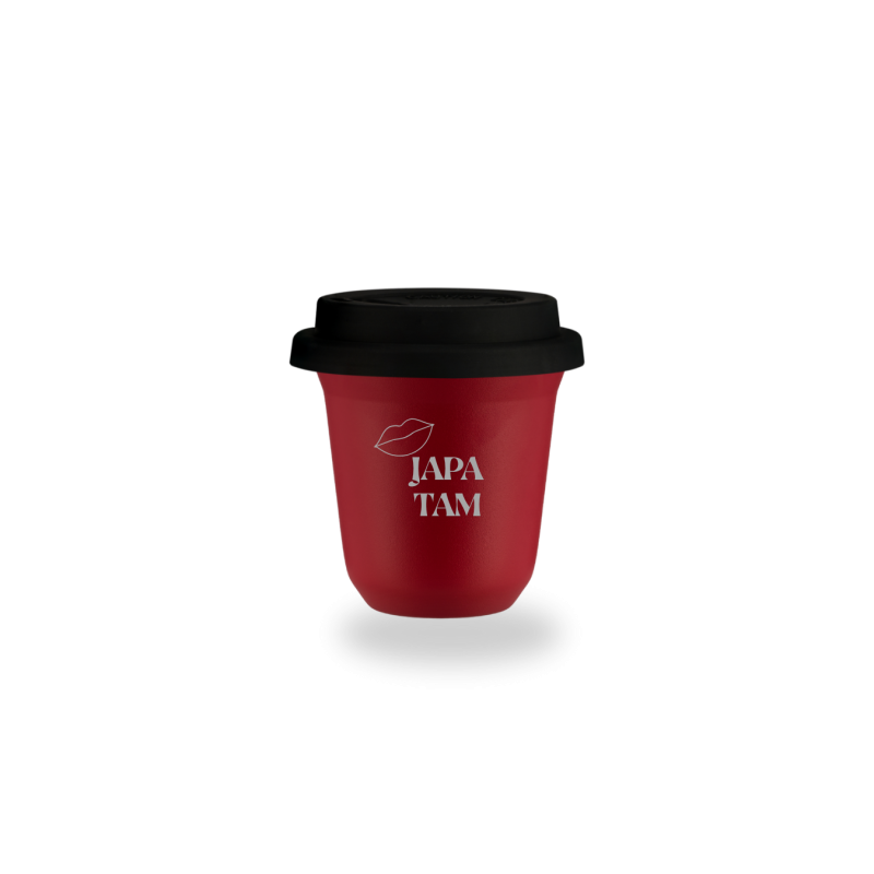 Kubek 240 ml CZERWONY "Japa tam", z pokrywką czarną