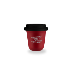 Kubek 80 ml CZERWONY "Budowlaniec z kawą w ręku - stawia ściany bez błędu", z pokrywką czarną